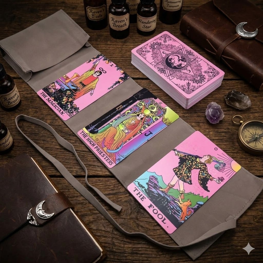 【魔女の旅支度】大人可愛いピンクの不滅タロット|巻きポーチ付き・PVC製78枚フルデッキ