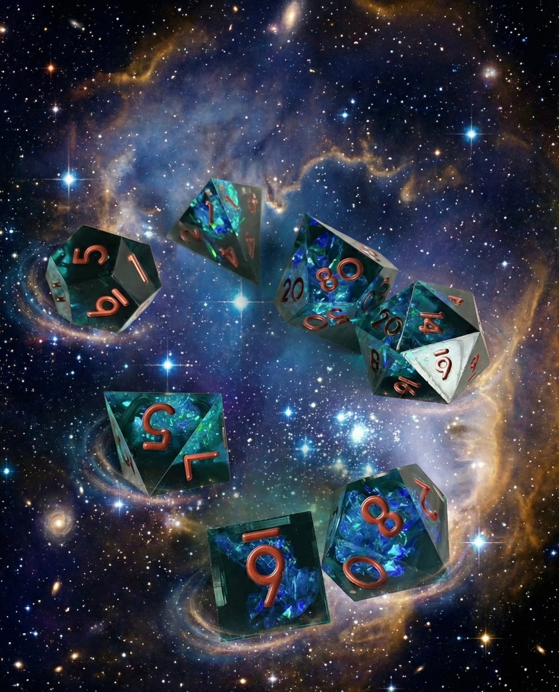 【銀河の軌跡】ラメ銀河ダイスセット|宇宙のロマンを手のひらに・TRPG&占い用7個セット(簡易ポーチ付き)