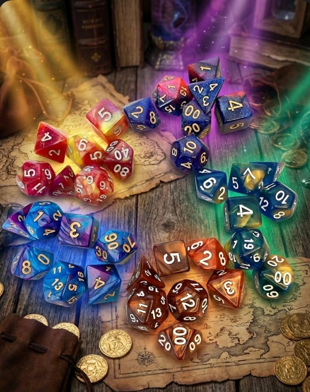 • 1セットの内容:4面、6面、8面、10面(0-9)、10面(00-90)、12面、20面