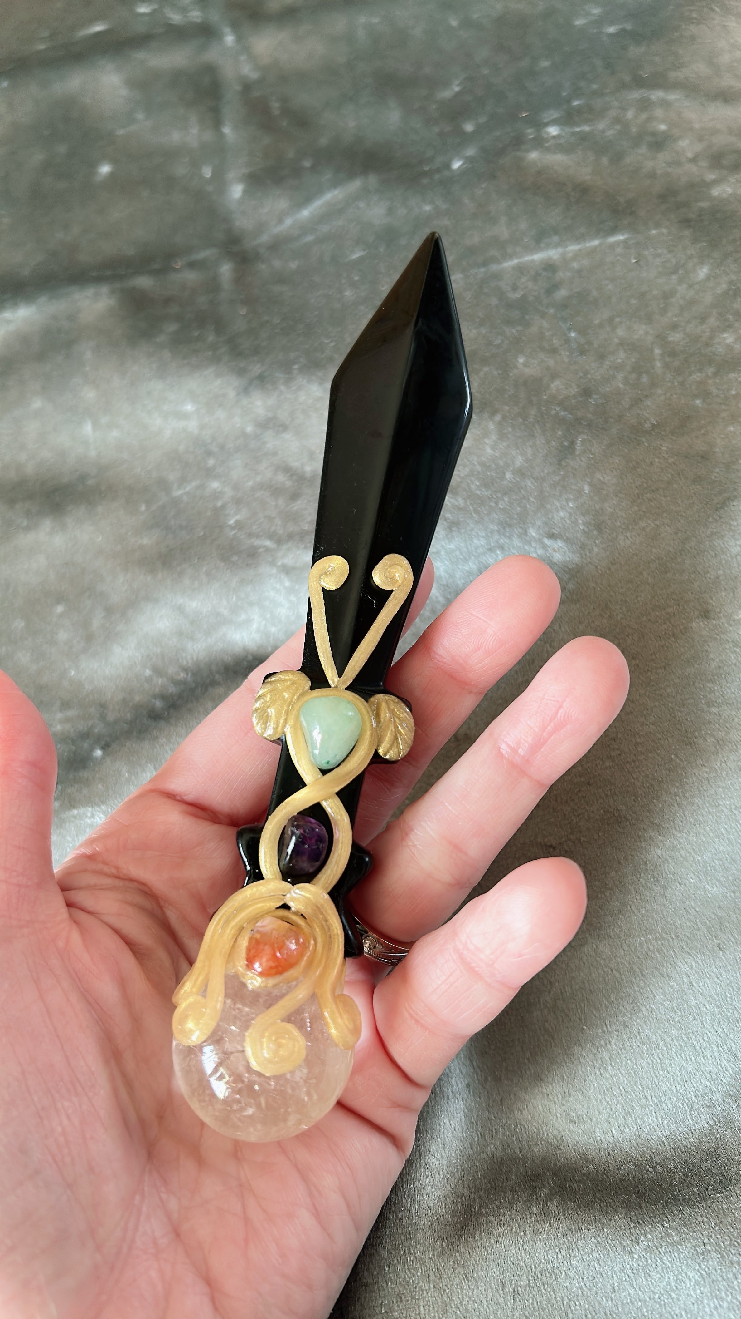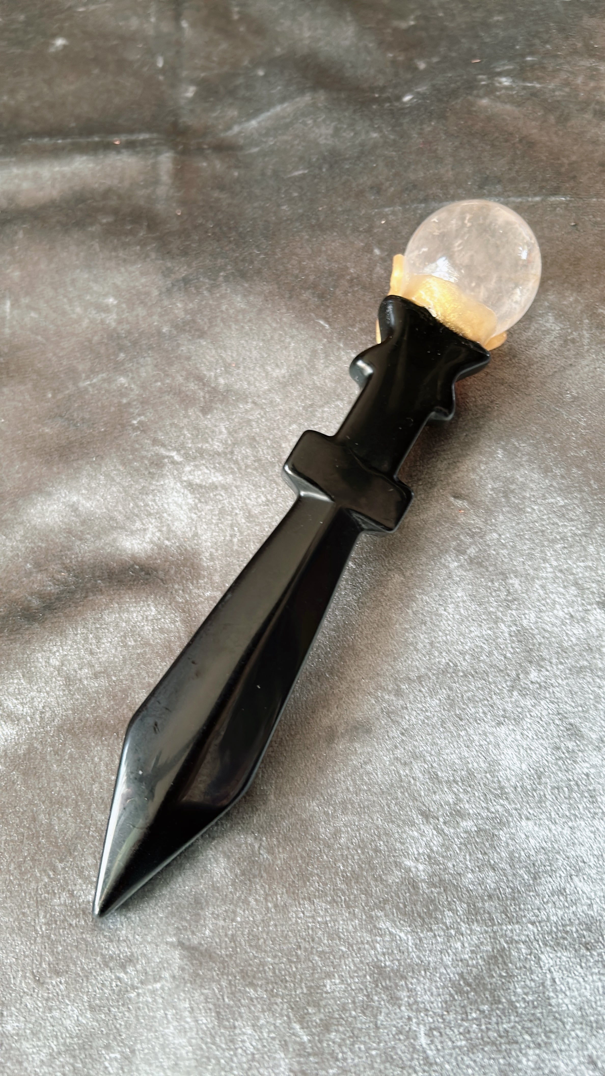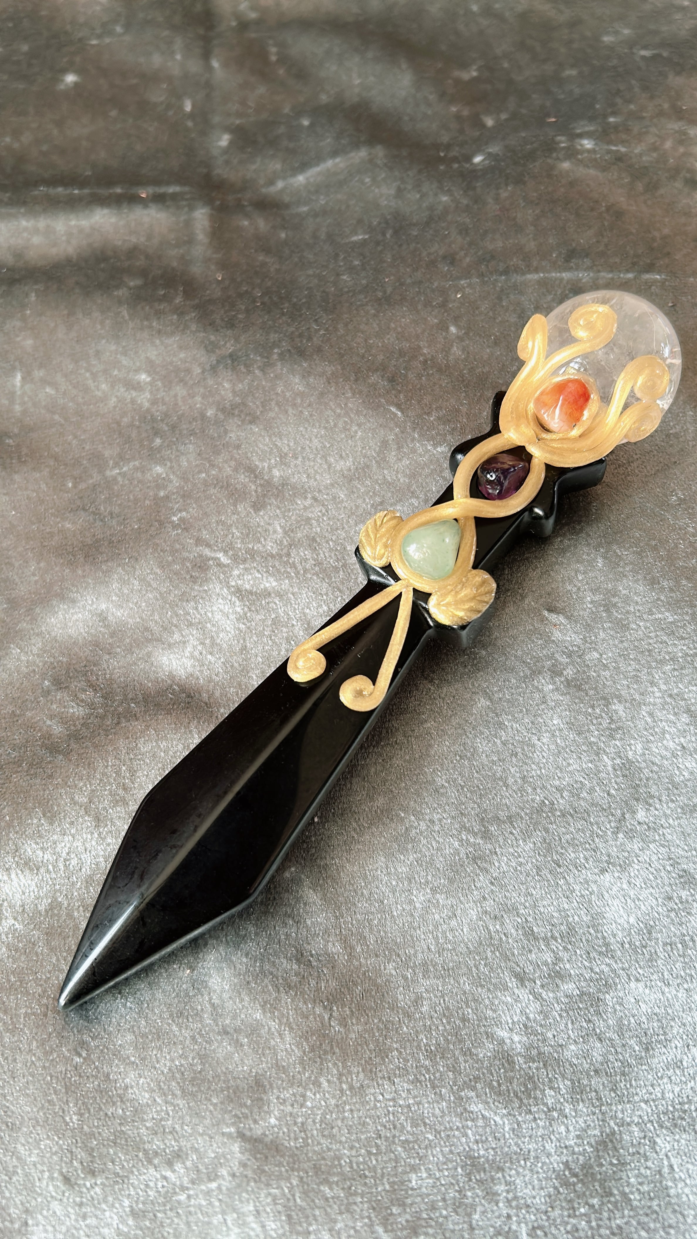 This ceremonial dagger, crafted from deep, abyssal Obsidian, is designed to help you sever lingering attachments and break through stagnation. Its exquisite design, reminiscent of ancient fantasy artifacts, instantly transforms the energy of any space, making it a powerful center-piece for your altar or divination table.