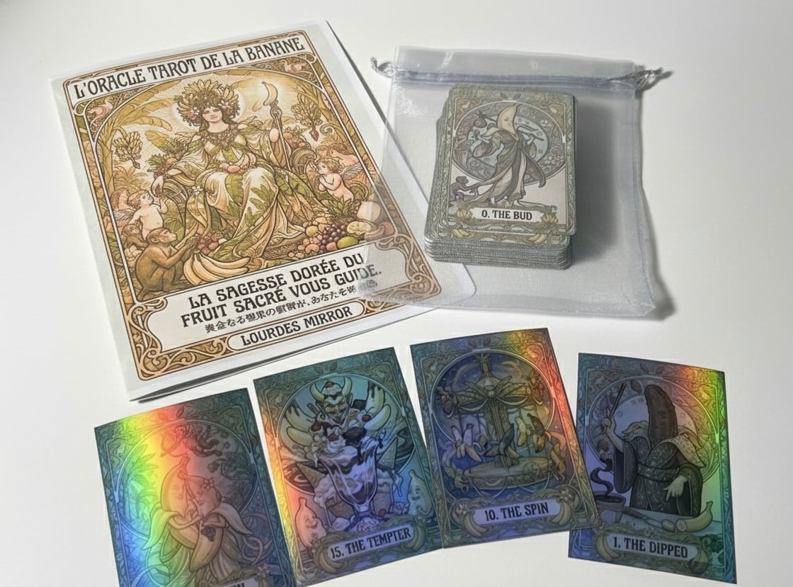 • AIアートワーク: 最新のAIをパートナーに、バナナが紡ぐシュールで神々しい世界観を表現した全27枚(タロット22枚+エクストラ5枚)の芸術。