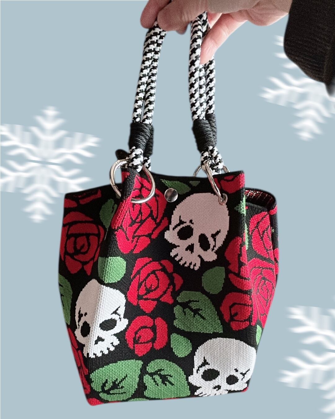 漆黒の背景に浮かび上がる、退廃的な美を象徴するドクロと、鮮血のように鮮やかな薔薇。 ゴブラン織り風の重厚な質感が魅力の「スカル&ローズ・バケットバッグ」をご紹介します。