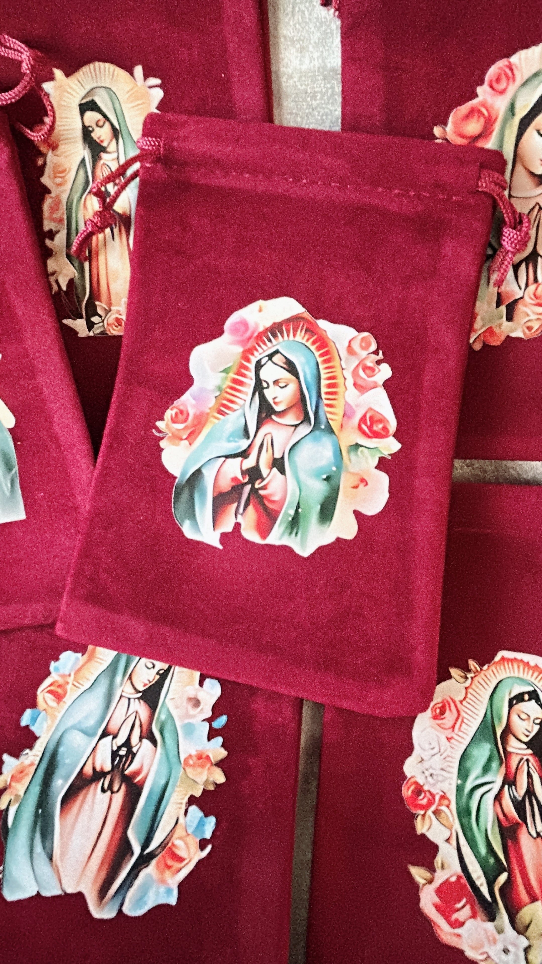 深く鮮やかな真紅のポーチに、奇跡の象徴である「グアダルーペの聖母」の意匠を施しました。