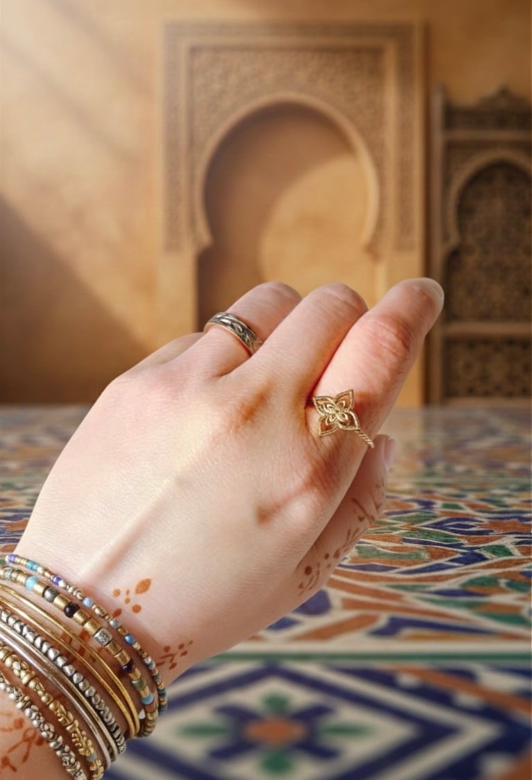中心に咲く四つ葉のモチーフは、古来より信仰、希望、愛、そして幸運を司るとされています。 指を包み込むアーム部分には繊細なツイスト加工が施され、フリーサイズ仕様でありながら、計算された美しさが宿っています。