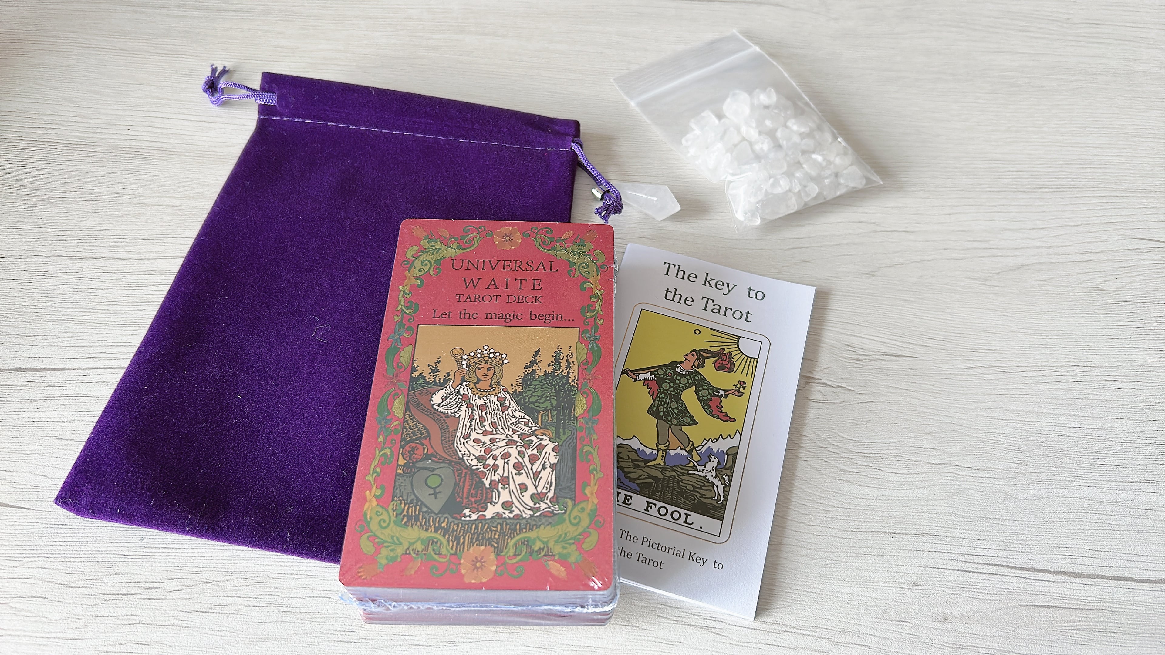 ・構成:78枚フルデッキ + ベルベットポーチ + 天然石チャーム + 浄化さざれ