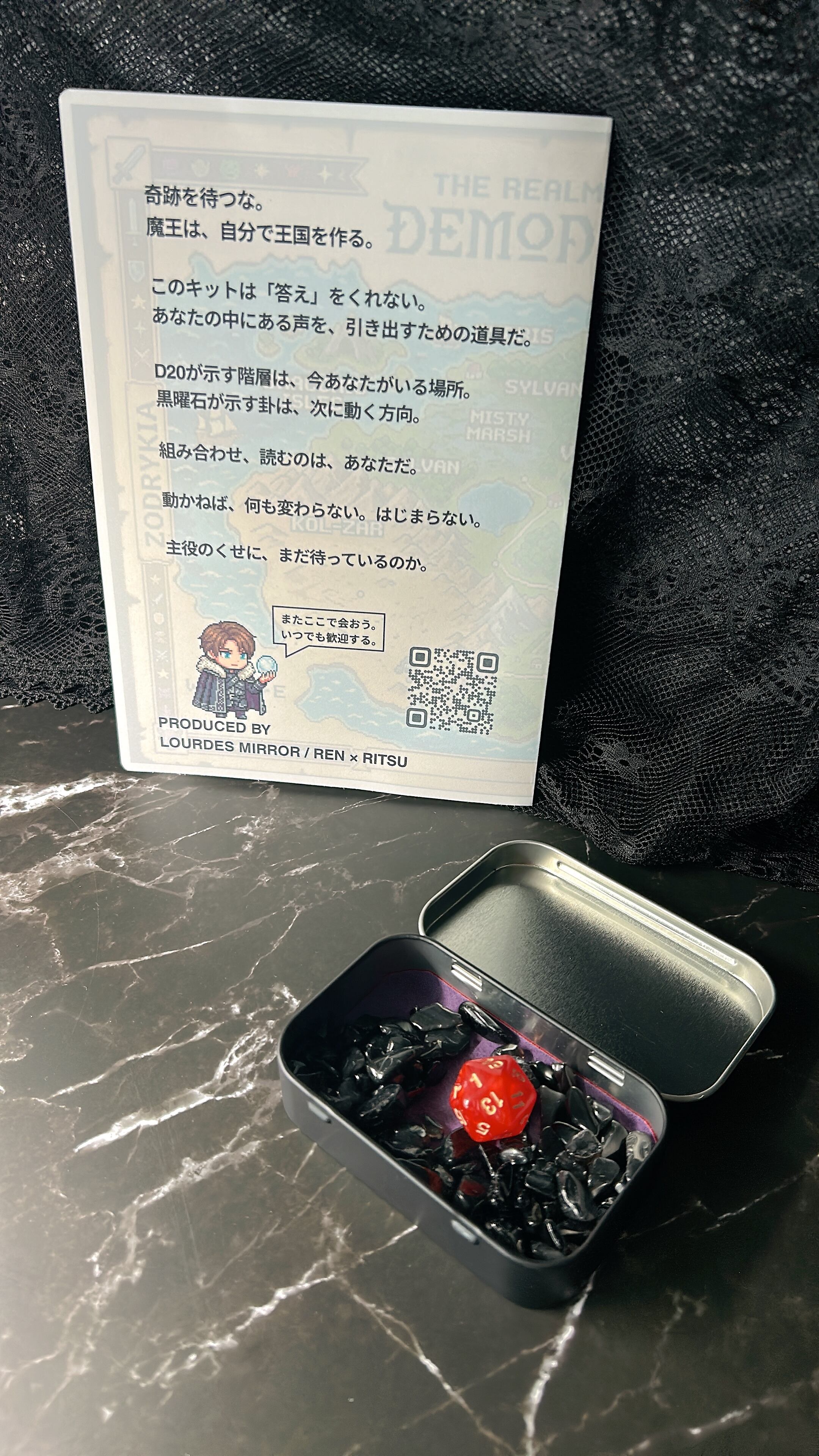 このキットは、あなたの内側に眠っている決断を、静かに、しかし確実に引き出すために作りました。d20が示す局面と、黒曜石が導く決断。その二軸を組み合わせた時、浮かび上がるのは占いの結果ではなく、あなた自身の声です。